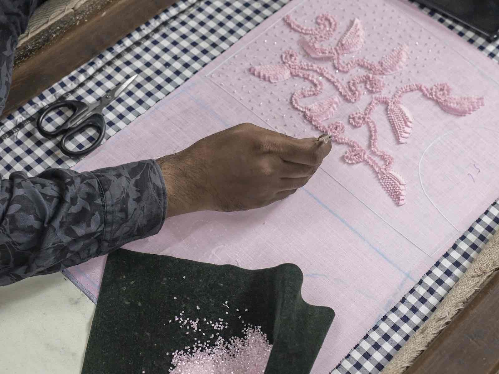 I had to go back to India. I booked my tickets said my goodbyes and started my journey. I spent endless days with my father and his team, learning, and understanding the traditional craft of fabric texturing. Getting awestruck by their unwavering dedication and attention to detail. Which material comes from where, which stitch means what, I experienced it all.